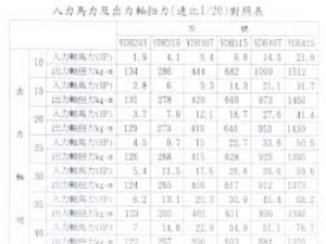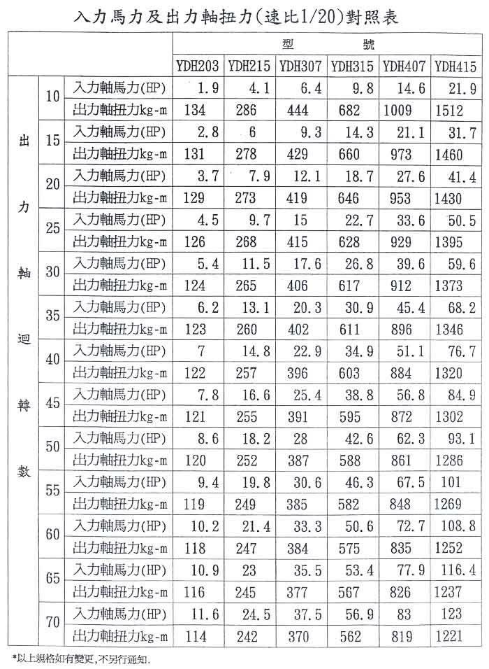 入力馬力及出力軸扭力對照(速比1/20)表